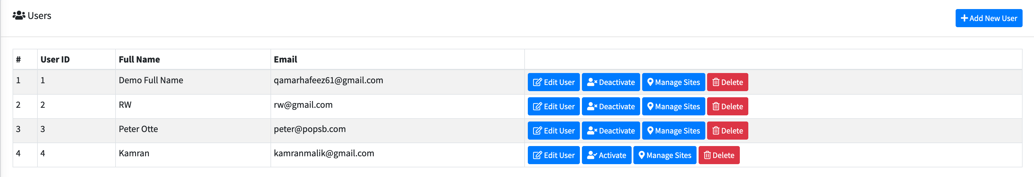 After a client successfully registered himself on the above url. Now administrator need to login to the system and he can view all the users at this url https://popapibridge.com/user. An adminstrator can activate the user who has requested him to activate. Screenshot below is showing a total of 4 users. 3 of the are activated and one needs to be activate. The users that are already activated will have "Deactivate" button, while the users who are not activated will have "Activate" Button.